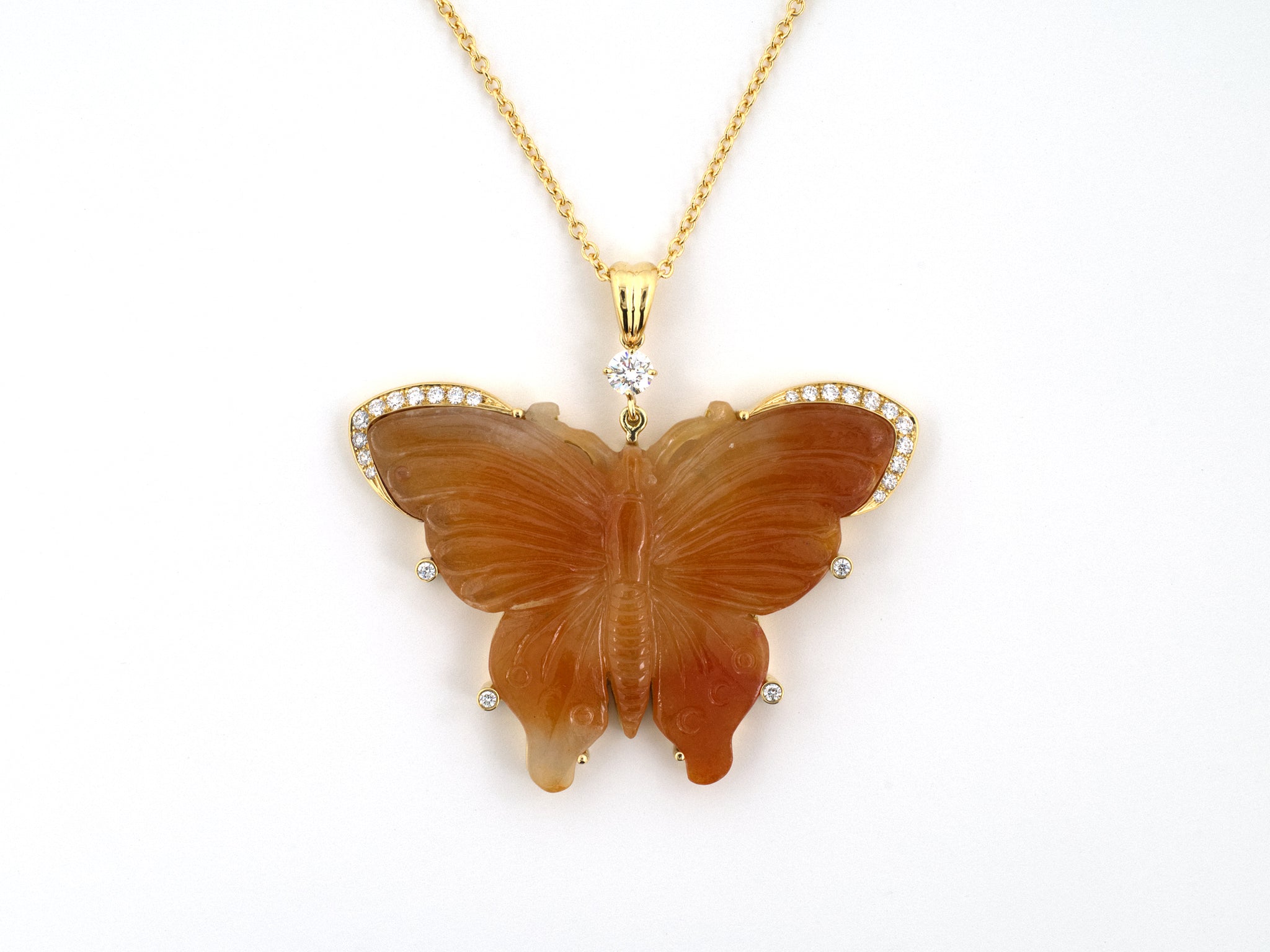 18K Yellow Gold Diamond Carved Orangy Jadeite Butterfly Pendant Necklace W/ 18" Cable Chain, 1 Orangy Jadeite Butterfly 36.43 CTS, 1 Diamond .23 CTS, 26 Total Diamonds .60 CTS