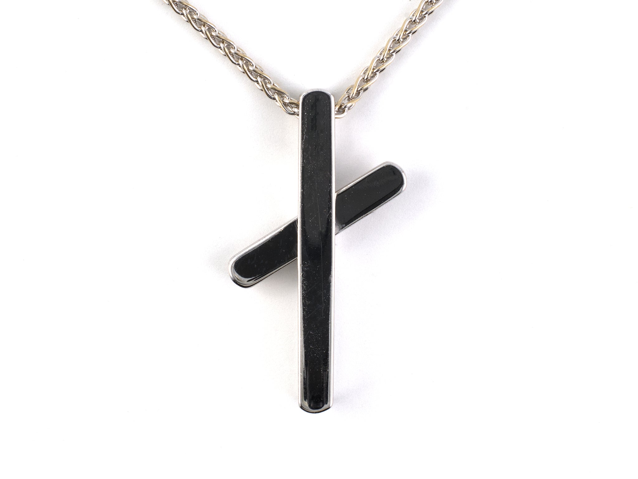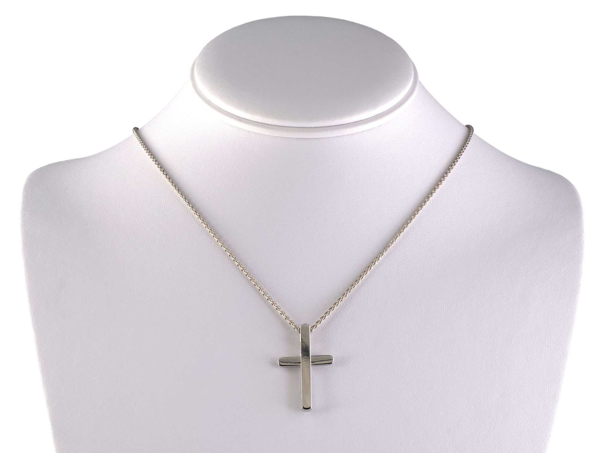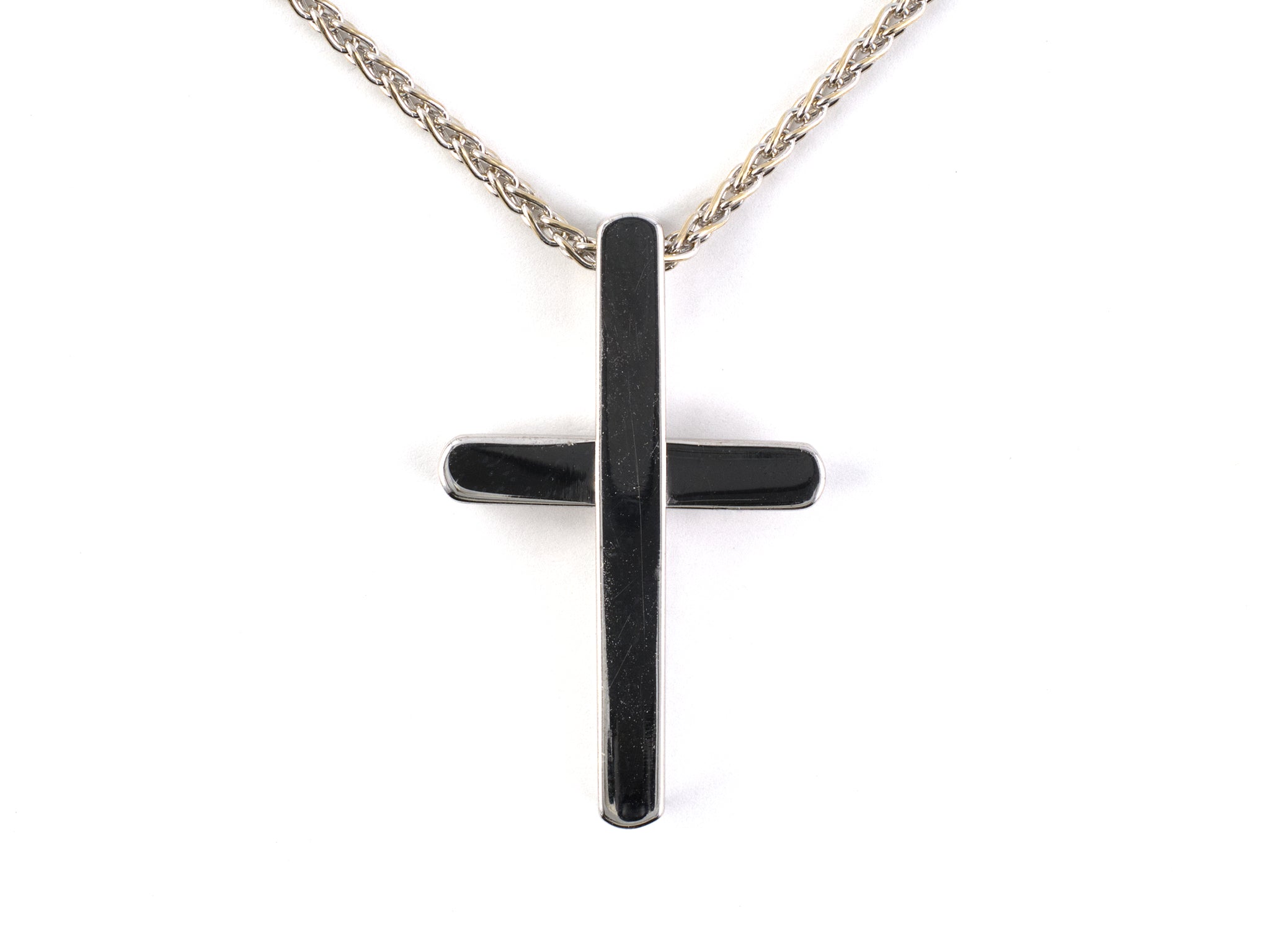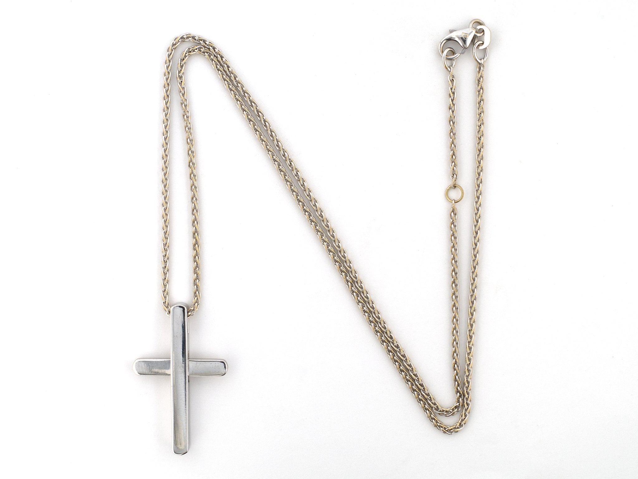 18K White Gold "Piaget" Hinged Center Cross Pendant Necklace W/ Signed 18" Wheat Chain