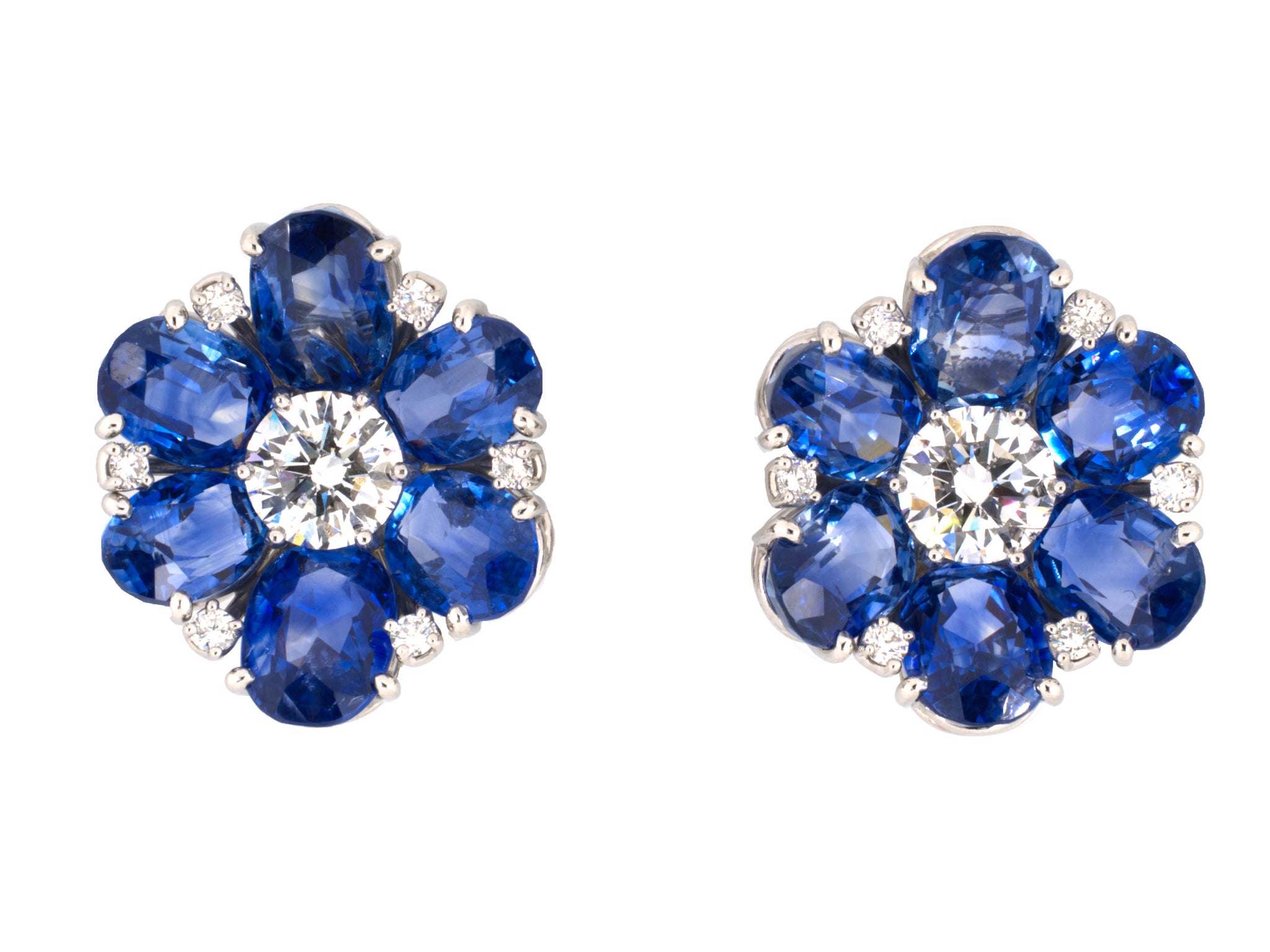Platinum Kashmir Sapphire Diamond "Cerro" Buttercup Cluster Earrings With Clip Backs, 2 Diamonds 1.82 CTS GIA (E- VS2, Triple Excellent ), 14 Diamonds 2.10 CTS Total Weight, 12 Ov Sapphires 18.18 CTS AGL "Kashmir, No Heat"