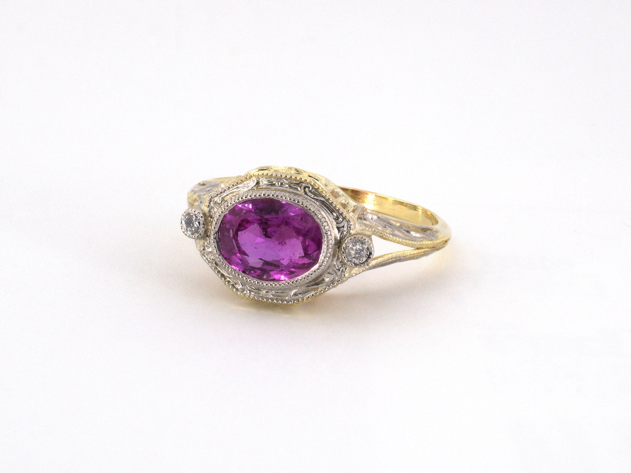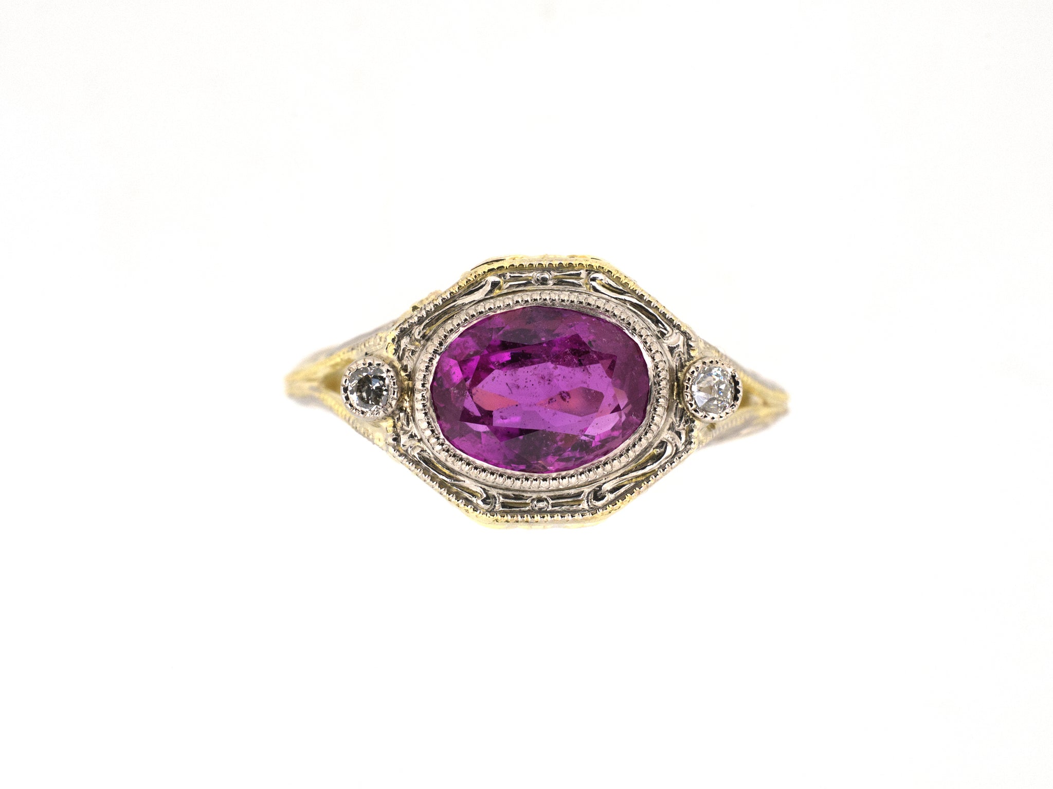 14K Yellow Gold Platinum AGL Pink Sapphire Diamond Edwardian Chased Bezel Carved Shoulder Cocktail Ring, Size 6 1/2, 1 Sapphire 1.87 CTS (AGL: "Ceylon - No Heat"), 2 Diamonds .05 CTS