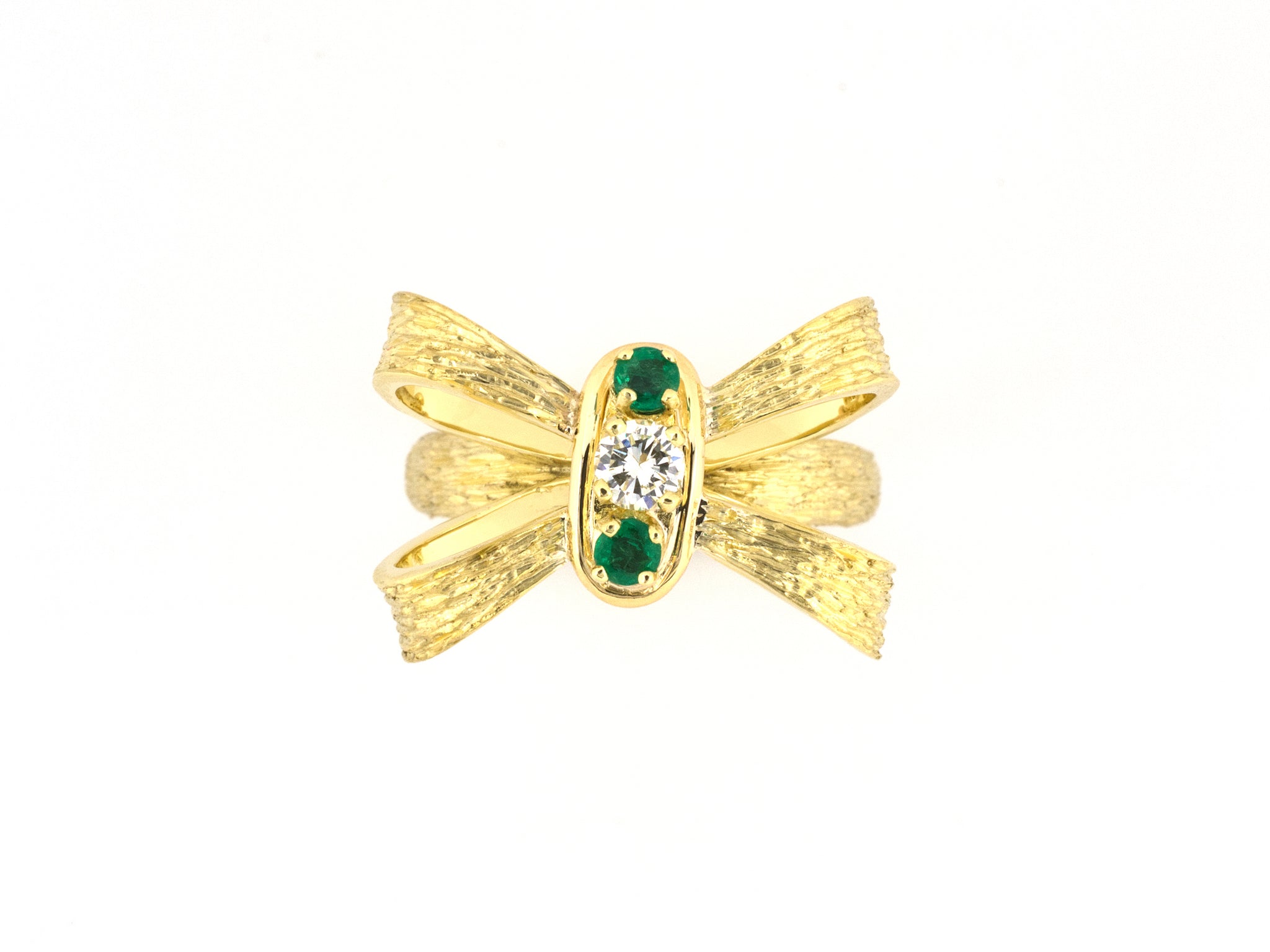 18K Yellow Gold Emerald Diamond 3-Stone Carved Textured Circa 1960S Bow Ribbon Ring, Size 6 1/4, 1 Mod Diamond .15 CTS, 2 Emeralds Est .15 CTS