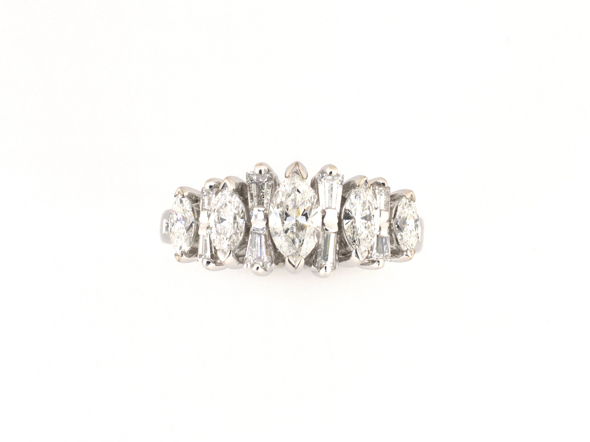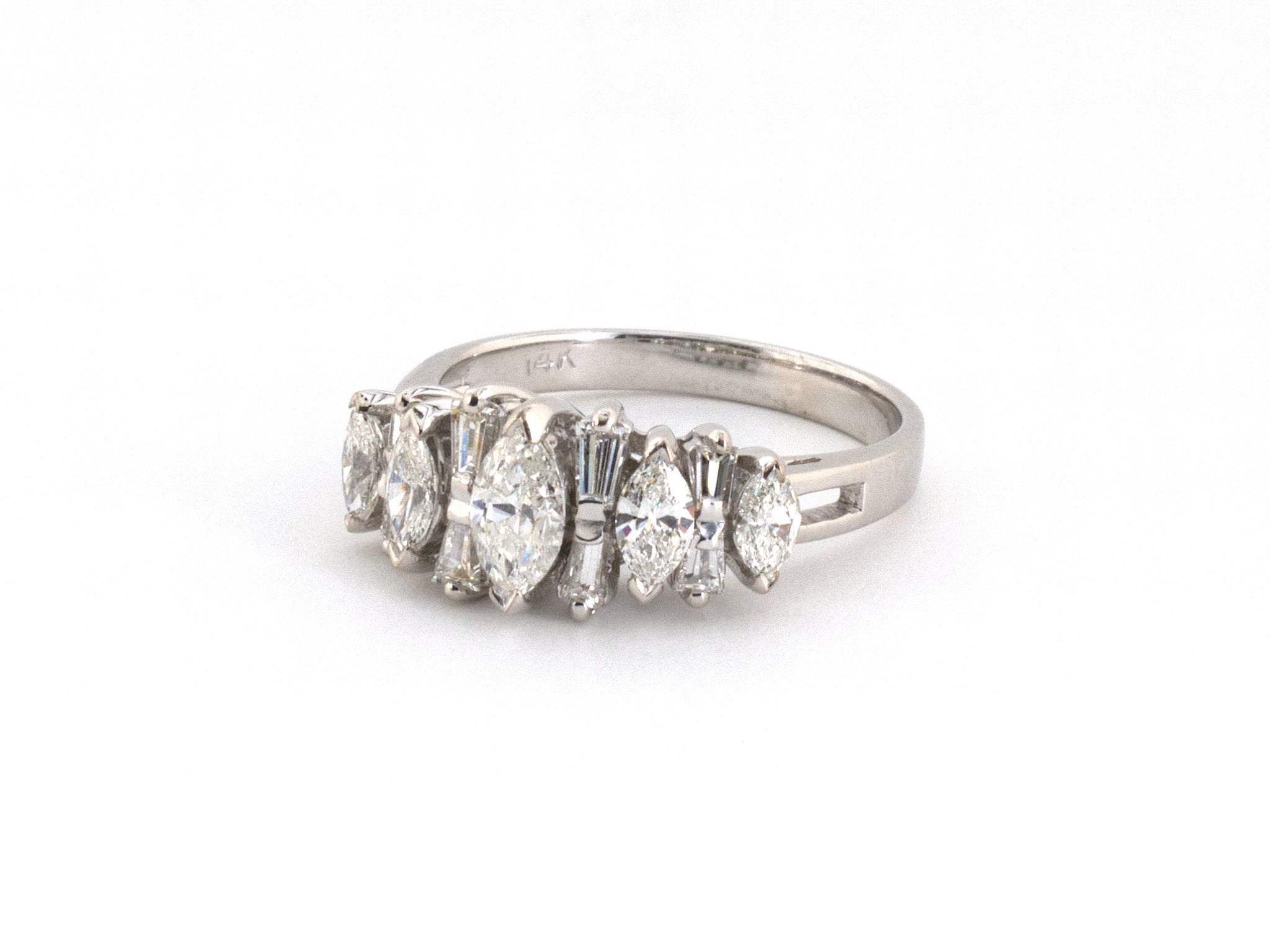 14K White Gold Diamond Wedding-Band 5-Stone Alternating Tapered Baguette & Marquise Ring, Size 5 1/2, 20 Diamonds Est 1.20 CTS