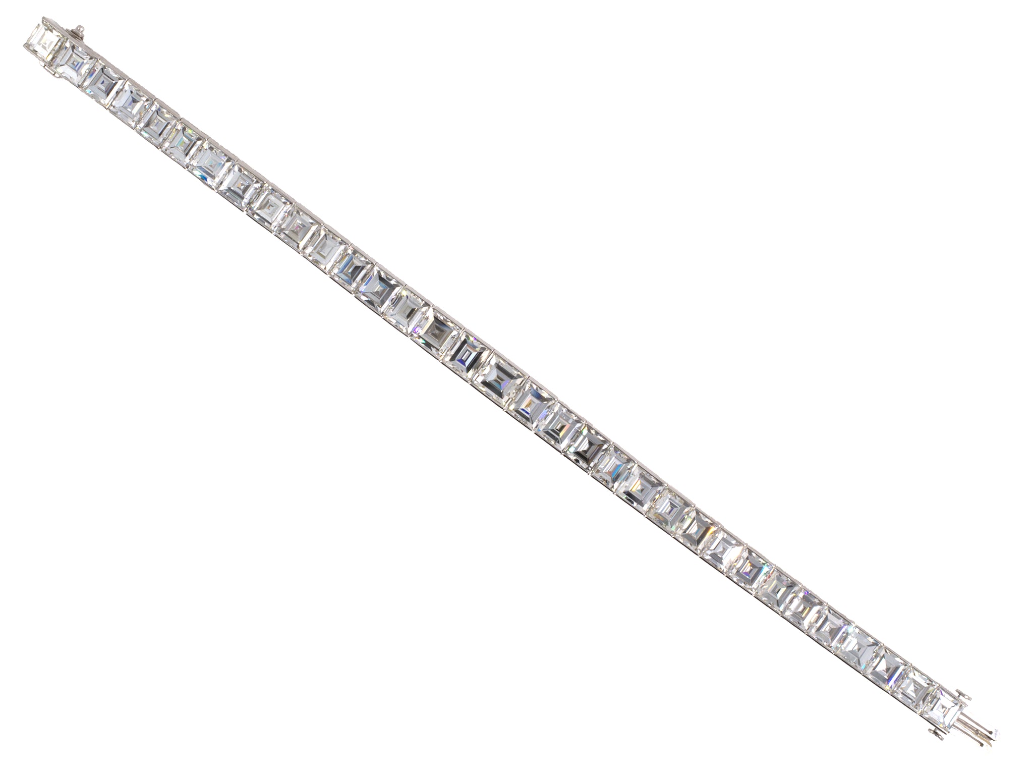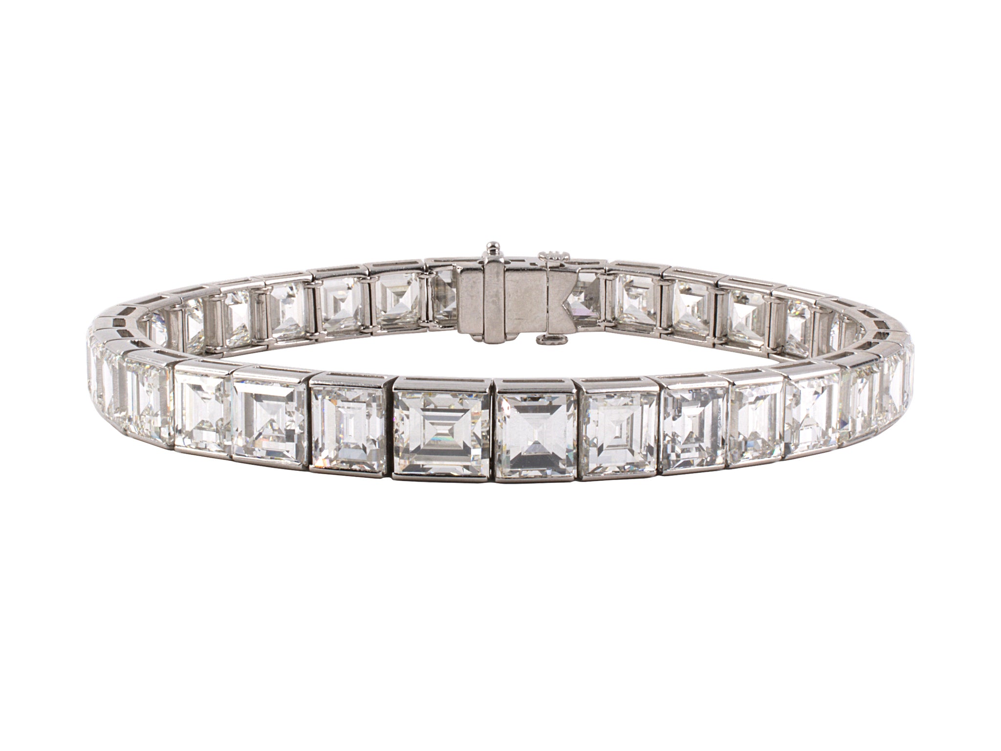 Platinum Diamond Art Deco Rectangle/Square Step Cut Tapered Line Bracelet With Airline Sides, Circa:1935, 7 1/4", 1 Square Step Cut Diamond Est 1.90 CTS, 33 Diamonds 40.30 CTS Total Weight