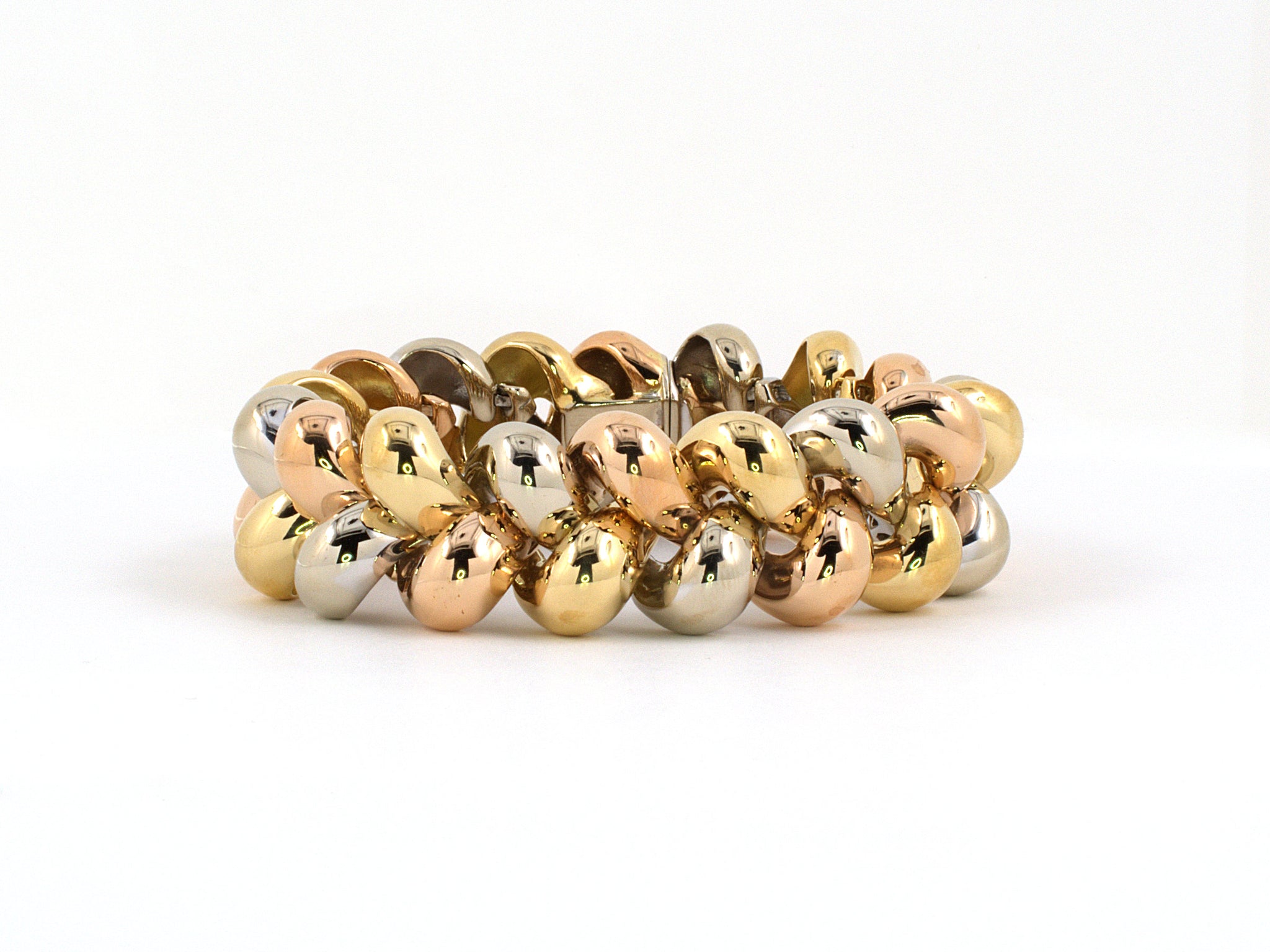 18K Yellow Gold White Gold Rose Gold (Tri-Color) Italy Retro Domed Tubular Link Bracelet, 7 1/4"