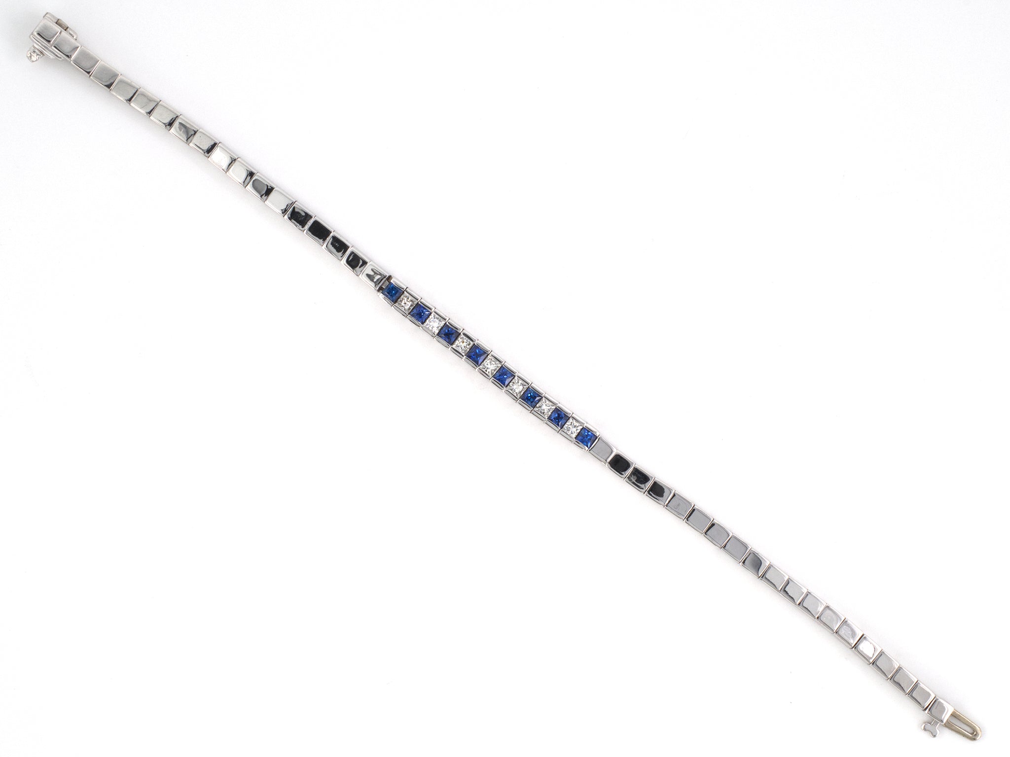 14K White Gold Diamond Sapphire Channel Set Alternating Box Link Bracelet7" 7 Diamonds Est .70 CTS, 8 Sapphires Est .95 CTS