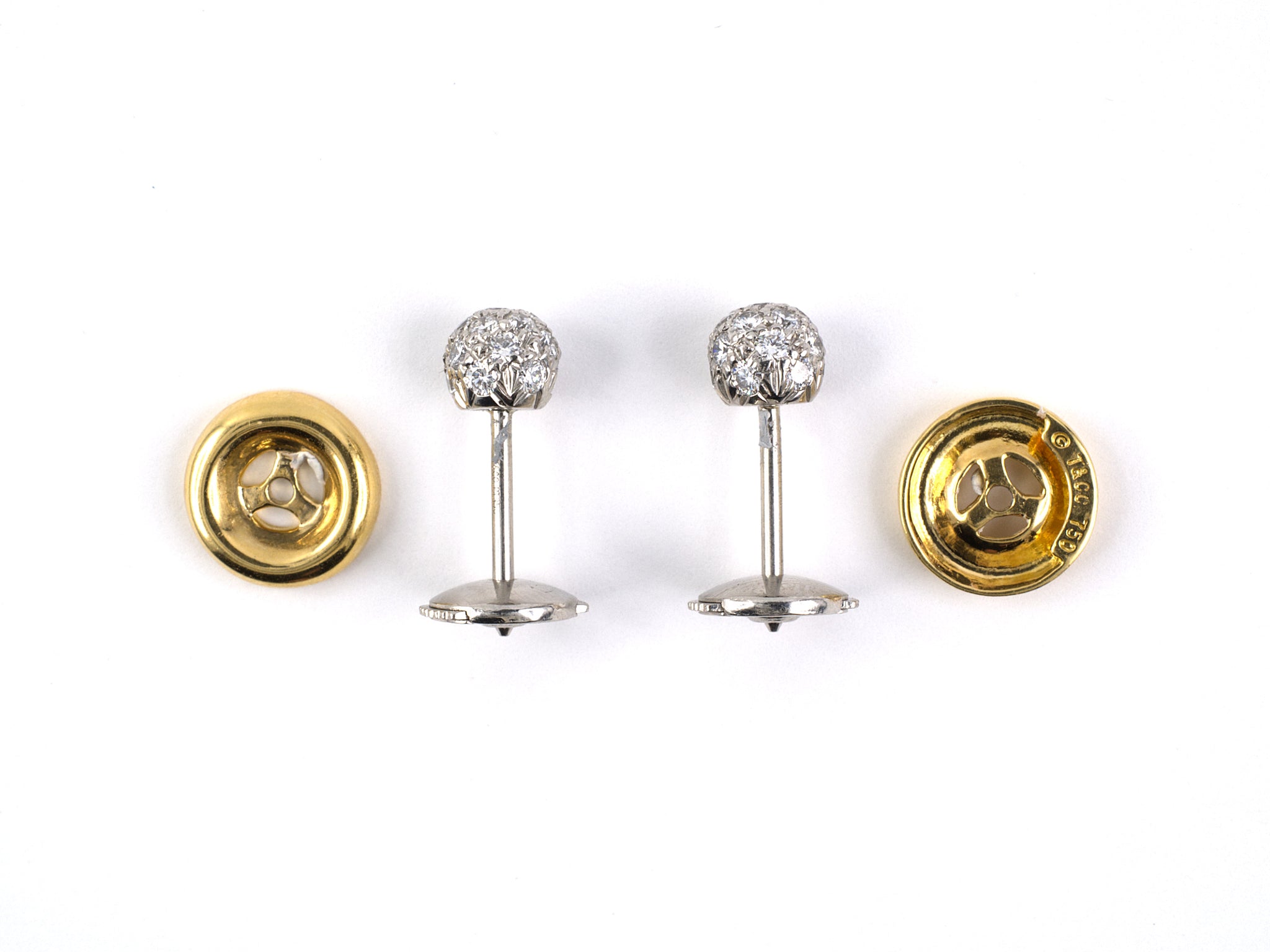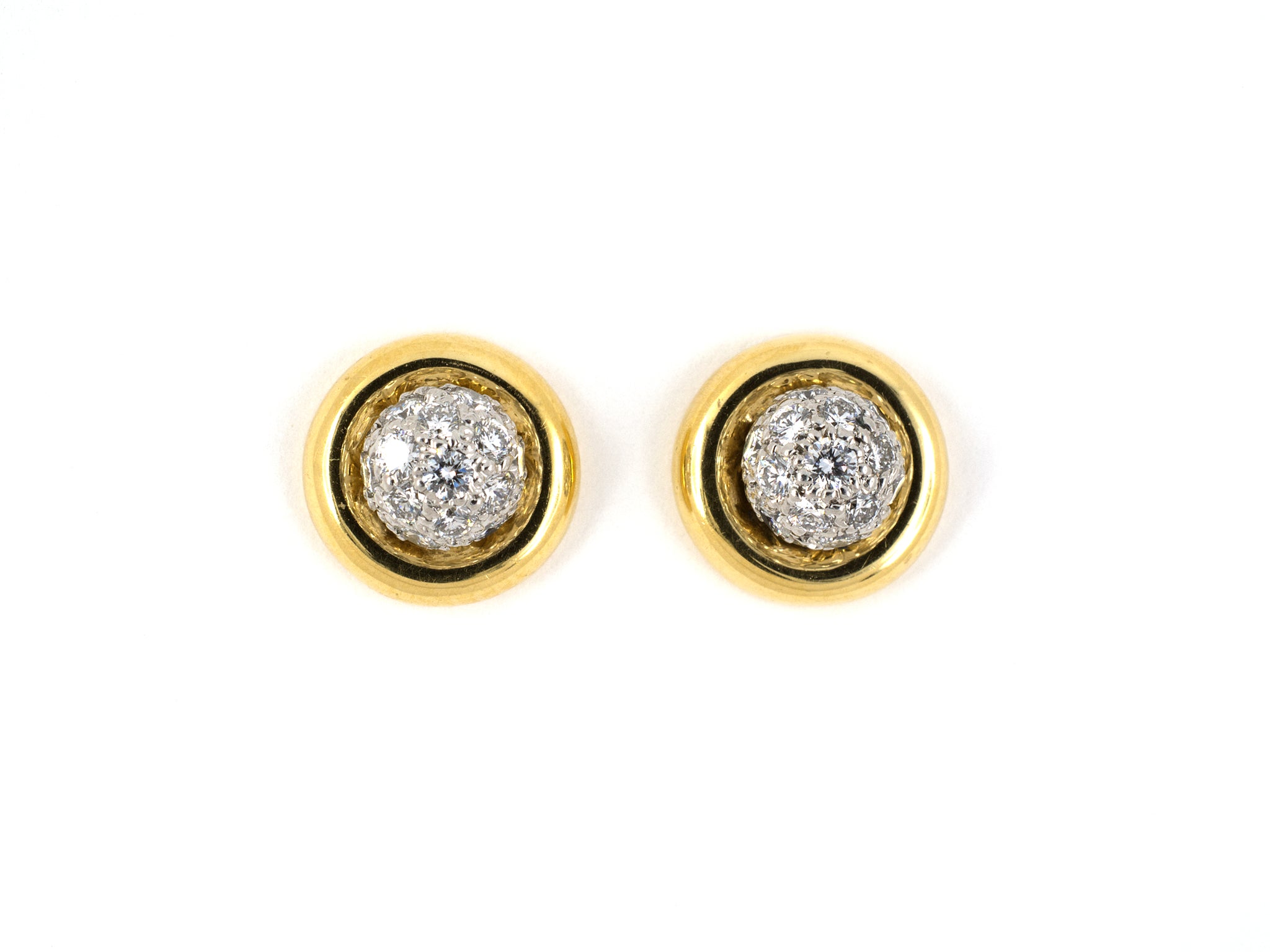 Platinum Pave Diamond Ball "Tiffany" Stud Earrings With 18K Yellow Gold "Tiffany" Jackets And Posts Clutch Backs, 38 Diamonds Est 1.05 CTS