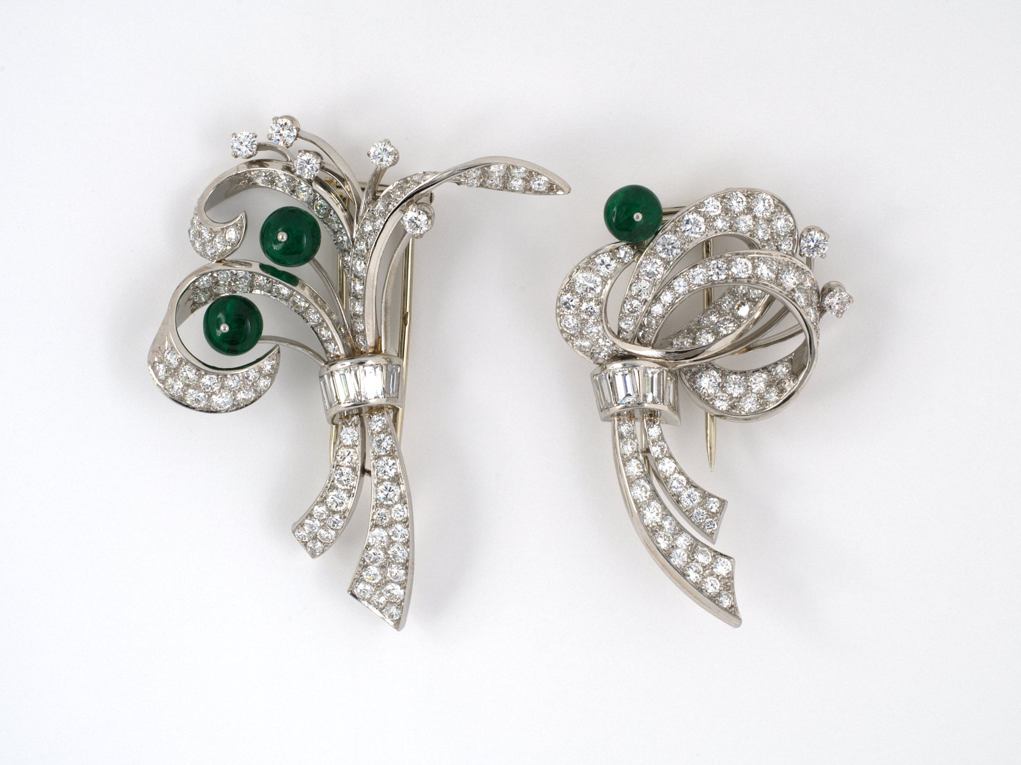 Platinum Diamond Emerald Beads Asymmetrical Floral Ribbon Spray French Made Pin Clips W/18K White Gold Frame, Circa 1950, 3 Emeralds Est Beads 4.25 CTS, 184 Diamonds Est 8.50 CTS
