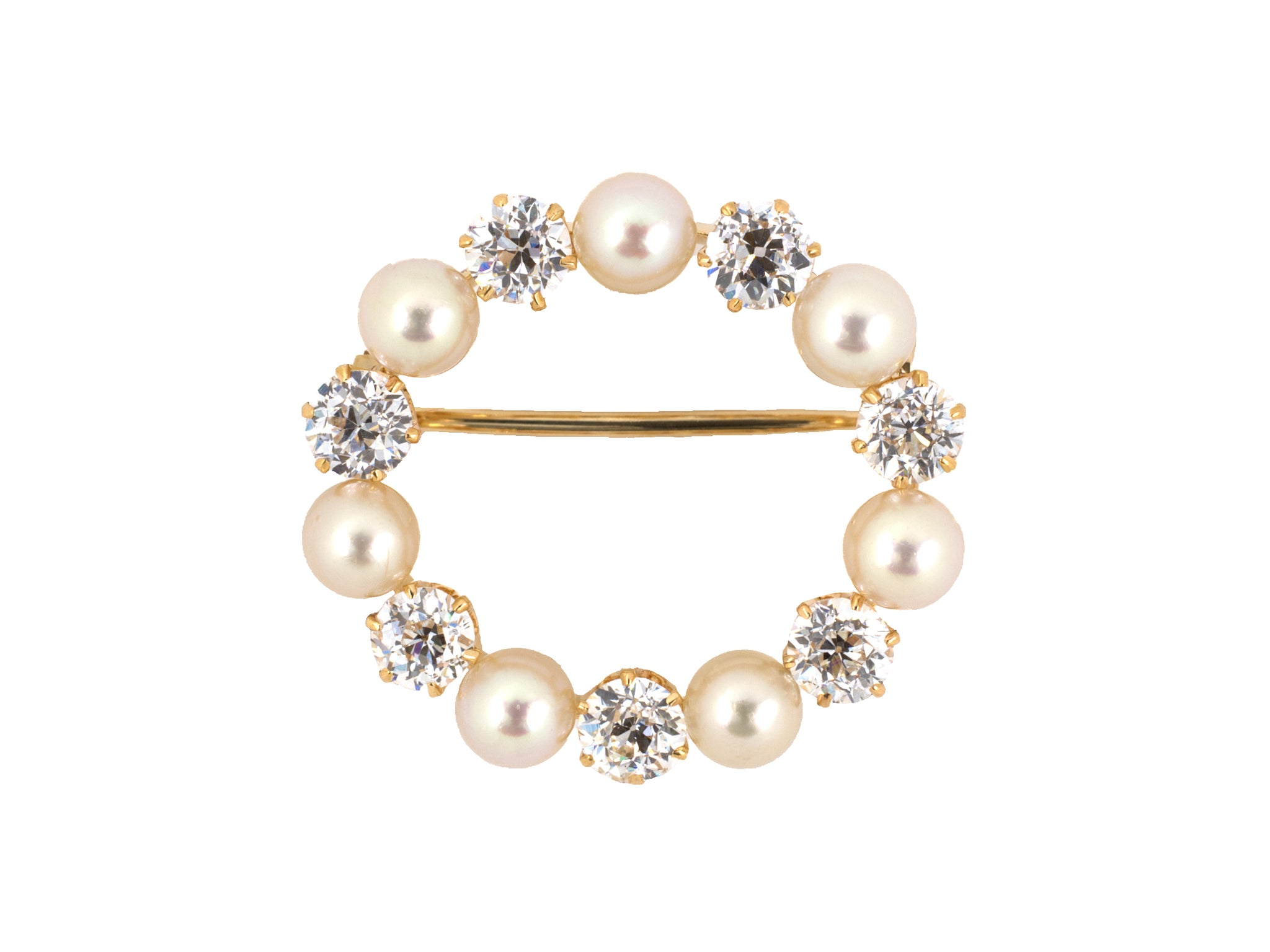 18K Yellow Gold Alternating Natural Pearl Diamond Victorian Oval Pin, 1" X 7/8" 7 Pearls GIA "Natural, Saltwater" 4.68Mm 4.53Mm, 7 Diamonds Est 2.00 CTS