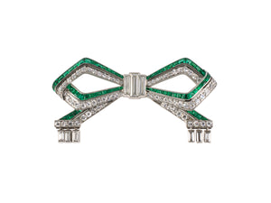 Platinum Diamond Emerald "Tiffany" Art Deco Geometric Bow Drop Dangle Pin W/ 14K Yellow Gold Pinstem, 1 3/4" X 1", 81 Diamonds Est 2.25 CTS, 64 Calibre Emeralds Est 1.00 CTS