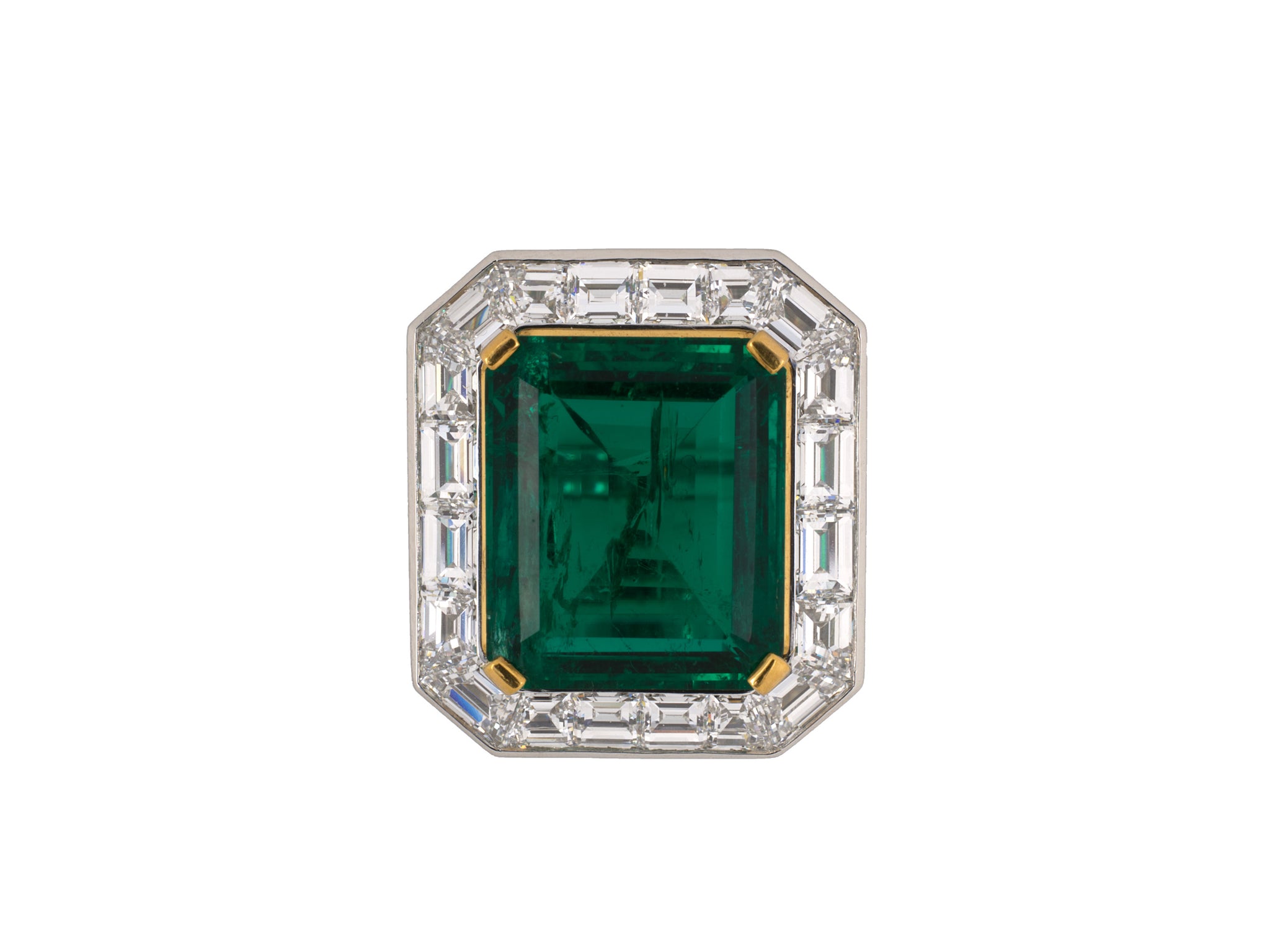 Platinum 22Kyg Emerald Cut Emerald Diamond Cluster Dinner Ring Size 6 1/4, 1 Emerald Cut Emerald 10.06 CTS AGL"Colombian, No Enhancement 28 Diamonds Est 5.55 CTS
