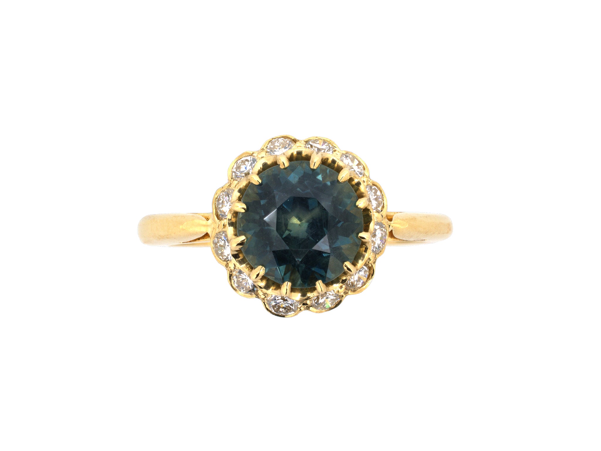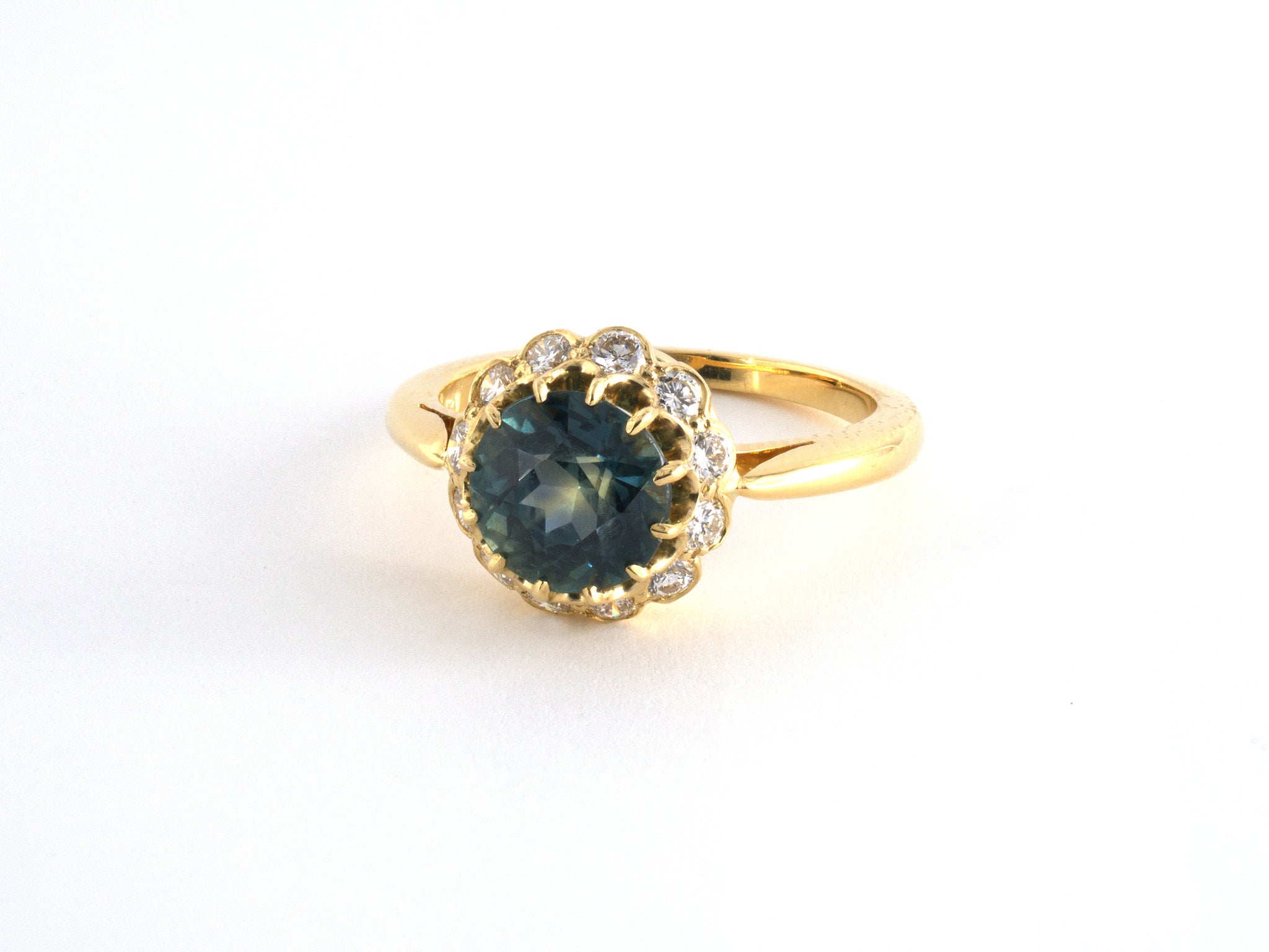 18K Yellow Gold AGL Sapphire Diamond Scalloped Cluster Ring, Size 5 1/4, 1 Sapphire 1.72 CTS AGL: "Montana - No Heat", 12 Diamonds .32 CTS