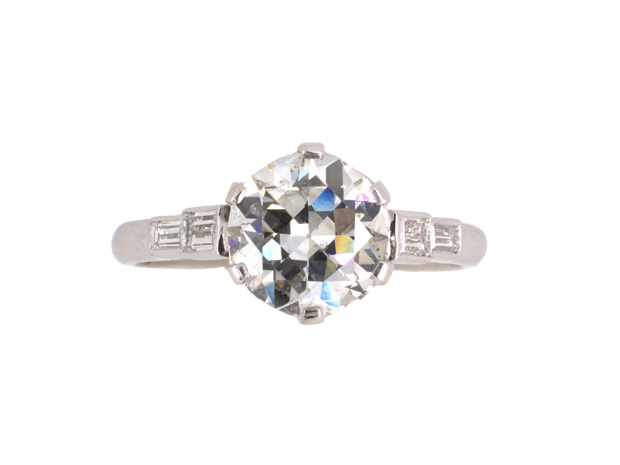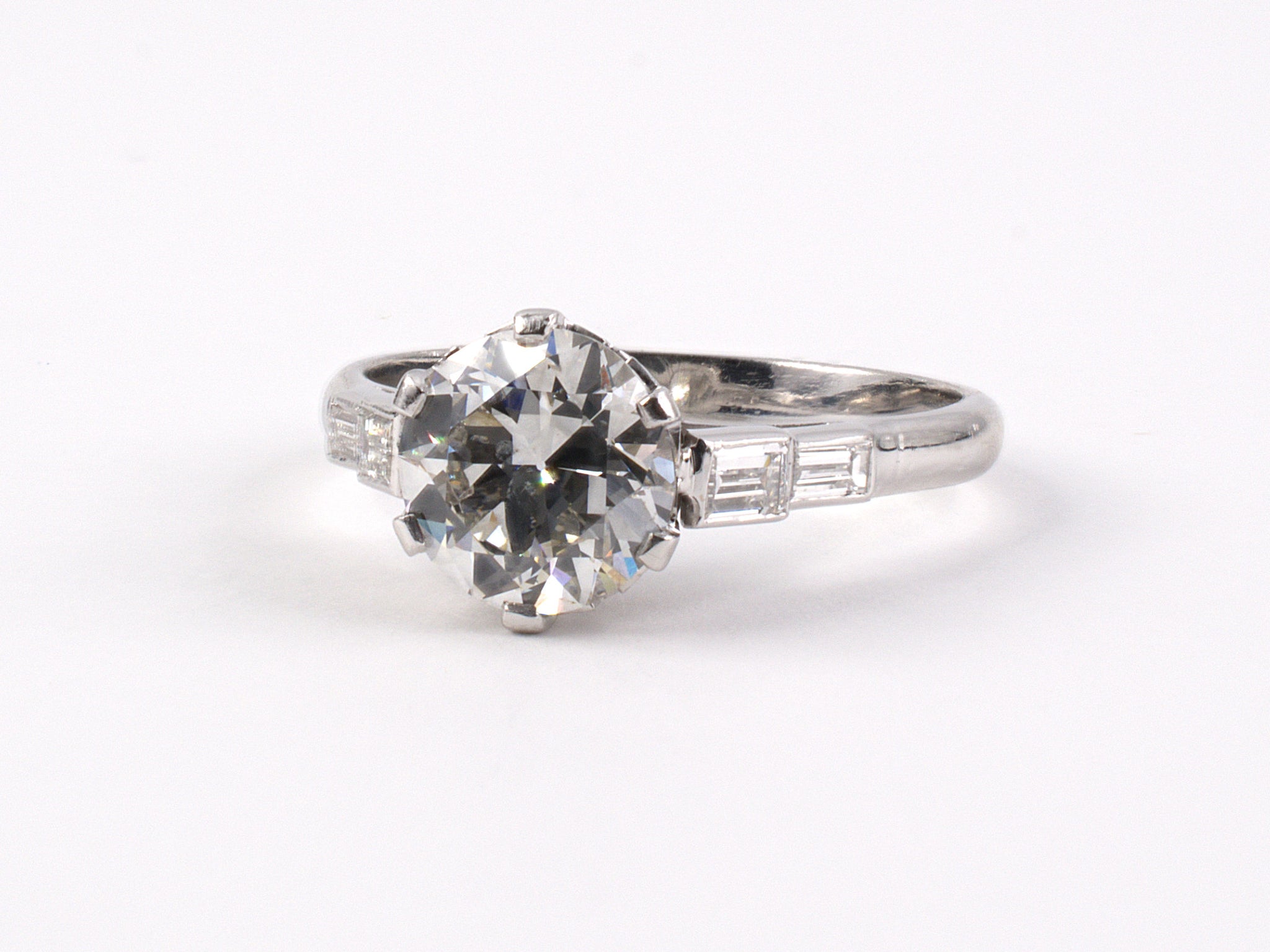 Platinum Diamond Art Deco Baguette Basket Engagement Ring, Size 6 1/4 1 European Cut Diamond 1.48 CTS, 5 Total Diamonds 1.68 CTS Total Weight
