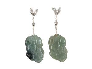 54391 - Platinum Diamond Leaf Carved Jadeite Frog Dangle Drop Earrings